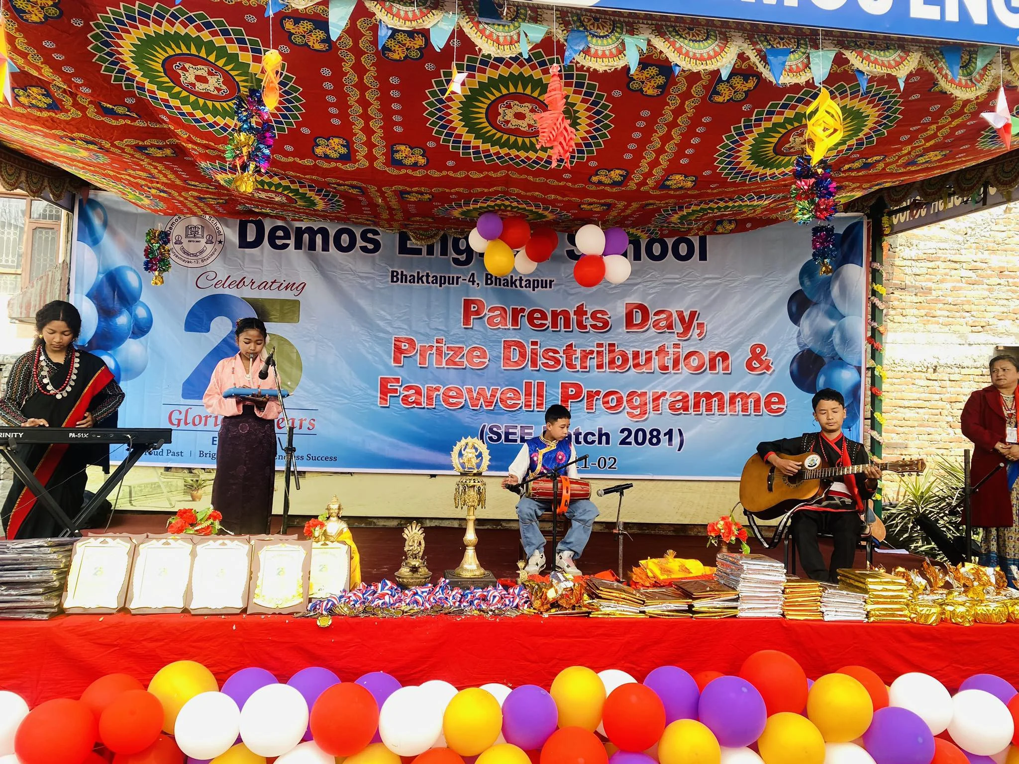 भक्तपुर भुलांचास्थित डेमोस इङ्गलिस स्कूलले स्थापनाको २५ औँ वर्ष पूरा गरेको सुखद अवसरमा अभिभावक दिवस, पुरस्कार तथा तथा एस.ई.ई. २०८१ व्याचको बिदाइ कार्यक्रम एक भव्य समारोहका साथ मनाएको छ।